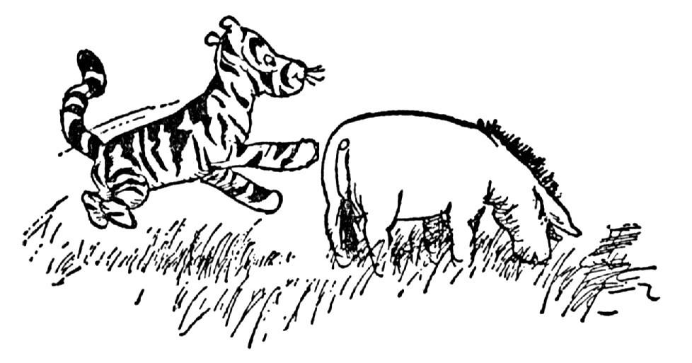 Rabbit never minded saying things again, so he asked where he should begin from; and when Pooh had said from the moment when the fluff got in his ear, and Rabbit had asked when that was, and Pooh had said he didn't know because he hadn't heard properly, Piglet settled it all by saying that what they were trying to do was, they were just trying to think of a way to get the bounces out of Tigger, because however much you liked him, you couldn't deny it, he didbounce.