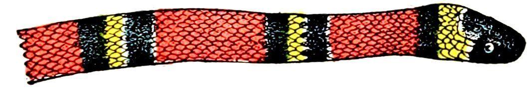 snake of North America (Figs. 277, 278). It is very strikingly coloured with rings of scarlet, yellow, and black. This is an example of warning coloration. The scarlet snake (Lampropeltis) has bands of scarlet, yellow, and black (coloured Fig. 6) of the same tints, and it is hardly distinguishable from the harlequin. The scarlet snake is said to mimic the harlequin snake. It also imitates the quiet inoffensive habits of the harlequin snake, which fortunately does not strike except under the greatest provocation. The rattles of the less poisonous but deadly rattlesnake (Fig. 272) may be classed as an example of warning sound which most animals are quick to heed and thus avoid encounters which might be destructive to either the snake or its enemy.