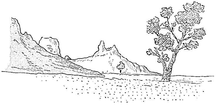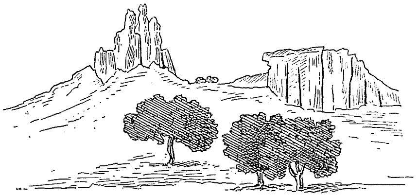 Fig. 17. — Ahaggar. La Coudia, vue de l’oued Sirsouf, près Tamanr’asset. L’Eisekran et l’Ikaraguen sont des plateaux basaltiques.