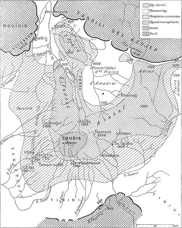 Dans la pénéplaine cristalline, qui forme le Sahara central, les régions naturelles, dont la définition doit tenir grand compte des conditions d’habitabilité humaine, seront donc caractérisées par leur altitude, plutôt que par la nature lithologique ou géologique de leur sol.