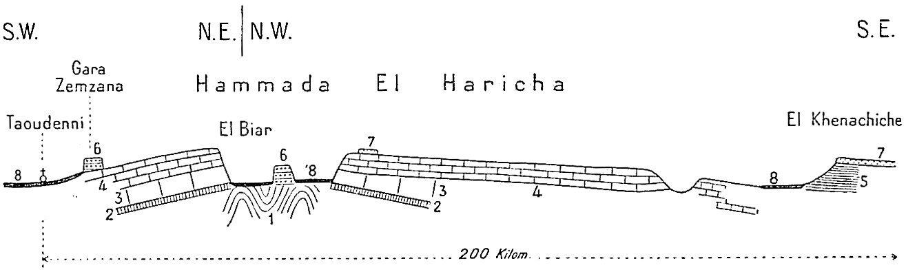 complètement d’aspect à partir du tassili de l’oued El Guessour. Au lieu d’une pénéplaine moyennement accidentée, constituée par l’Archéen et le Silurien, tous deux imperméables, cette nouvelle partie du tanezrouft se montre formée de grès horizontaux d’âges divers, en majeure partie dévoniens autour d’In Azaoua, beaucoup plus jeunes probablement entre l’Aïr et Bilma.