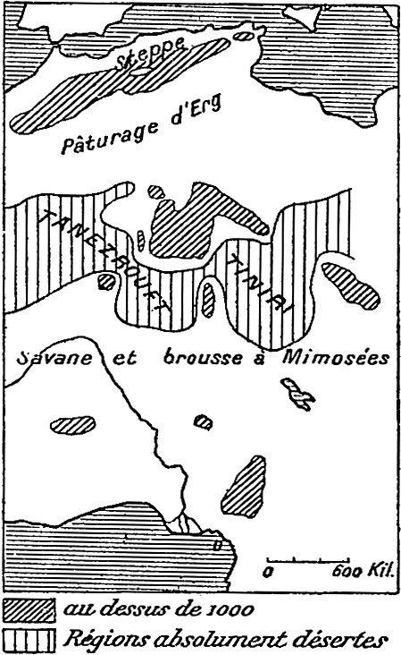 Ces parties stériles du Sahara, ces tanezrouft commencent à être assez bien délimités ; ils jouent un rôle insignifiant dans le Sahara algérien où la prédominance des ergs assure presque partout quelques pâturages ; dans le Sahara soudanais, au contraire, ils forment une bande ininterrompue qui, de l’est à l’ouest, s’étend sur une grande longueur au nord de la zone sahélienne (cf. fig. 58), et que l’on pourra sans doute suivre du voisinage de l’Atlantique jusqu’aux confins de l’Égypte ; cette bande est singulièrement large au sud de l’Ahaggar ; seules les inflexions qu’imposent, vers le nord, à la limite des pluies tropicales, l’Adr’ar’ des Ifor’as et l’Aïr, en facilitent heureusement la traversée.