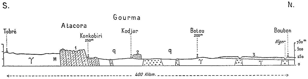 Il est assez difficile pour le moment d’attribuer un âge à ces grès ; les plissements qu’ils ont subis par place, permettent de croire qu’ils sont anciens. On les a souvent classés dans le Trias par analogie avec une formation semblable, mais bien éloignée, celle du Karoo dans l’Afrique australe. Il vaudrait mieux, ce semble, les rapprocher des grès des tassili du Sahara dont ils reproduisent l’allure tectonique. La distance qui sépare, géographiquement, les grès dévoniens de Timissao et de l’oued Tagrira, des plateaux du Gourma et de Bandiagara, est encore bien considérable, même si l’on attribue au Dévonien la bande de grès, plongeant de 45° vers le sud, que Gautier a vue au sud de l’Adr’ar’ des Ifor’as entre les terrains cristallins et le Crétacé, les grès horizontaux injectés de filons de quartz qui reposent sur le Silurien à Tosaye, et les schistes, interstratifiés de grès, que j’ai signalés dans le lit du Niger, à Labezzanga, où ils dessinent un synclinal à axe est-ouest.