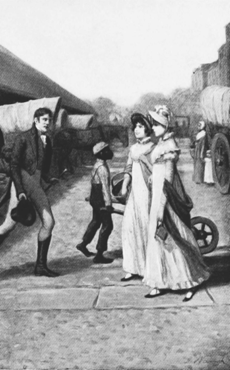 This touched Lettice to the quick. She looked up archly from under her long lashes. “Then I’ll be good, Rhoda,” she said. “Come, we’ll go to market for aunt. I want you to see our Marsh market. Strangers think it is a real pretty one.” And the two girls departed, Lettice with basket on arm, curls dancing, and step light; Rhoda with a deep consciousness of the proprieties, giving not so much as a side glance to the young blades who eyed them admiringly as they passed down Market Street. But Lettice dimpled and smiled as this or that acquaintance doffed his hat, so that presently Rhoda said sarcastically, “It is plain to see why you like to come to market, Lettice.”