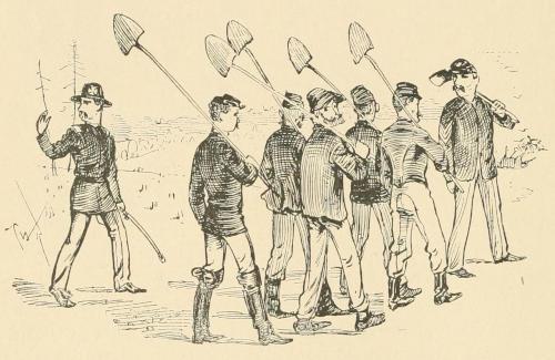 from the grave, it is the last straw to an already overburdened sentimental soul; his emotions overpower him, and, turning his back on the deceased, he utters something which sounds like “hurrah! without the h,” as Mark Twain puts it, repeating it with increasing emphasis. But he is not to express his enthusiasm on this question alone a great while. There are more sympathizers in the party than he had anticipated, and not recruits either; and in less time than I have taken to relate it more than half the detail, gallantly led off by the officer of the day, are standing about, leaning over at various angles like the tomb-stones in an old cemetery, disposing of their hardtack and coffee, and looking as if ready to throw up even the contract. The profane man is among them, and just as often as he can catch his breath long enough he blank blanks the government and then dives again. The rest of the detail stand not far away holding on to their sides and roaring with laughter. But I must drop the curtain on this picture. It has been said that one touch of nature makes the whole world kin. Be that as it may, certain it is that the officer, the good duty soldier, the recruit, and the beat, after an occasion of this kind, had a common bond of sympathy, which went far towards levelling military distinctions between them.