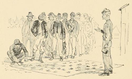 powders, taking a little from one pile and adding to another. The sugar which always accompanied the coffee was spooned out at the same time on another blanket. When both were ready, they were given out, each man taking a pile, or, in some companies, to prevent any charge of unfairness or injustice, the sergeant would turn his back on the rations, and take out his roll of the company. Then, by request, some one else would point to a pile and ask, “Who shall have this?” and the sergeant, without turning, would call a name from his list of the company or detachment, and the person thus called would appropriate the pile specified. This process would be continued until the last pile was disposed of. There were other plans for distributing the rations; but I have described this one because of its being quite common.