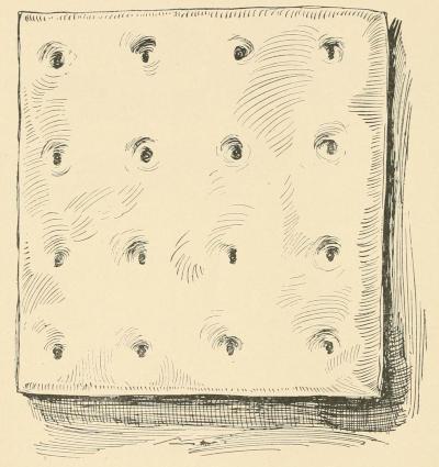 The third condition was when from storage they had become infested with maggots and weevils. These weevils were, in my experience, more abundant than the maggots. They were a little, slim, brown bug an eighth of an inch in length, and were great bores on a small scale, having the ability to completely riddle the hardtack. I believe they never interfered with the hardest variety.