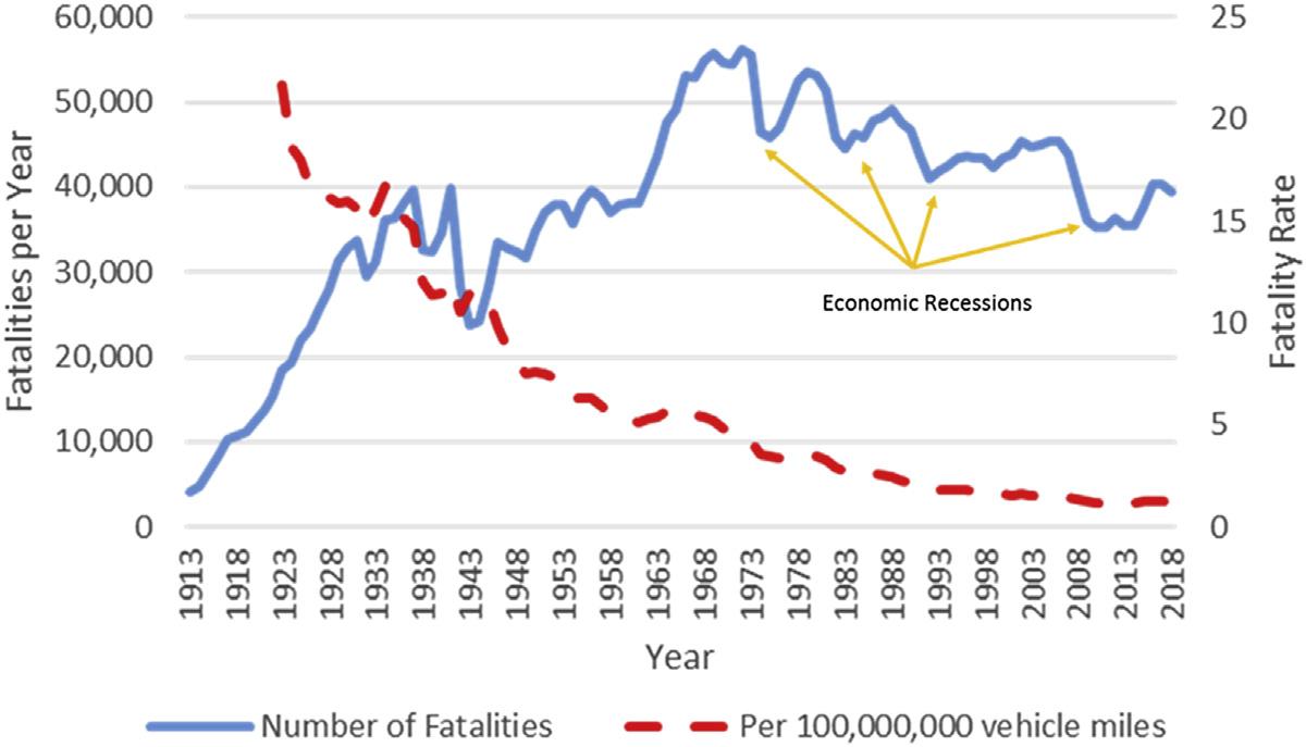 Althoughalotofefforthasbeenplacedbyagenciesacrosstheworldto reducethenumberandseverityofcrashes1 viaimprovementsinhighway design,vehicletechnology,trafficpolicy,emergencyservices,andthelike, theeffectsofhighwaycrashesonroadtransportnetworksarestillamajor sourceofmorbidity(LordandWashington,2018). Fig.1.1 illustratesthe historicalstatisticsinroadwayfatalitiesintheUnitedStatesbetween1913 and2018(similartrendshavebeenobservedamongmostindustrialized countries).Thisfigureshowsthatthetrendinroadwayfatalitieshasbeen slightlygoingdownsinceearly1970s,withsharpdecreasesduringeconomicrecessions(furtherdiscussedlater).Thisfigurealsodemonstrates thatwhenthevaluesareanalyzedbytakingintoaccountthevehiclemiles traveled(ameasureofexposure),theratehasbeengoingsignificantly downsincethebeginningofofficialcrashdatacollectedbythefederal government.Eventhoughthecrashrateshowsagreatreduction,theraw numbers,asapublichealthmeasure,arestillthemostimportantfactor thatguidestheallocationofresources.Forexample,althoughthecrash rateisgenerallygoingdown,thenumberofinjuredpeoplearrivingat variousemergencyroomslocatedwithinajurisdiction,orthepatient