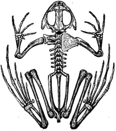 External Features.—The frog may be said to have two regions in its body, the head and the trunk. A neck hardly exists, as there is only one vertebra in front of the shoulders (Fig. 252), while mammals have seven neck (cervical) vertebræ. There are no tail (caudal) vertebræ, even in the tadpole state of frogs and toads.