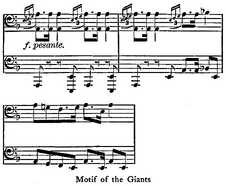 It is, like themselves, heavy, lumbering, with a slur that is like the stumbling of heavy feet. Clumsy and ungraceful, it and what it represents cross the idyllic beauty of the motifs of Friea, Walhalla, the Ring, the Rhinegold, and the rest, with a harsh and disagreeable sense of an inharmonious element. How different from the majestic gods, and the clever, small-souled Nibelungs, are these great creatures who are all bodies and no brains, and who are so ably represented by the music allotted them in the operas! Yet, in their own way, they and their motif are extremely picturesque!