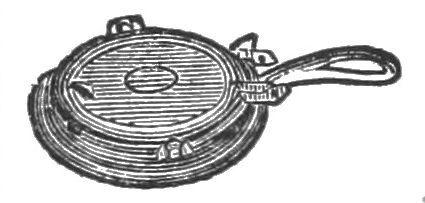 London Crumpets.—1½ pints flour, ½ teaspoon salt, 1 teaspoon sugar, 2 teaspoons Royal Baking Powder, 1 egg, nearly a pint milk and cream in equal parts, 1 teaspoon extract cinnamon. Sift together flour, salt, sugar, and powder; add beaten egg, milk, cream, and extract; mix into rather firm batter; half fill large greased muffin-rings (fig. XVII) on hot, well-greased griddle. Bake on one side of them only. Serve hot with cottage cheese.