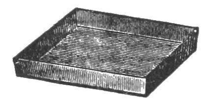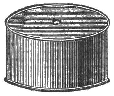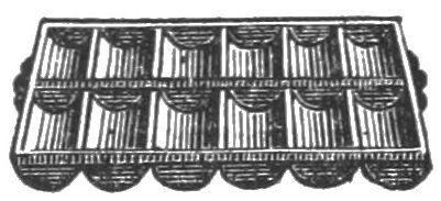 Corn Bread (New Orleans).—1½ pints Indian corn meal, ½ pint flour, 1 tablespoon sugar, 1 teaspoon salt, 2 heaping teaspoons Royal Baking Powder, 1 tablespoon butter or lard, 1¼ pints milk, 2 eggs. Sift together corn meal, flour, sugar, salt, and powder; rub in the shortening, add eggs (beaten) and the milk; mix into a moderately stiff batter; pour from bowl into shallow cake-pan (fig. XIII). Bake in rather hot oven 30 minutes.