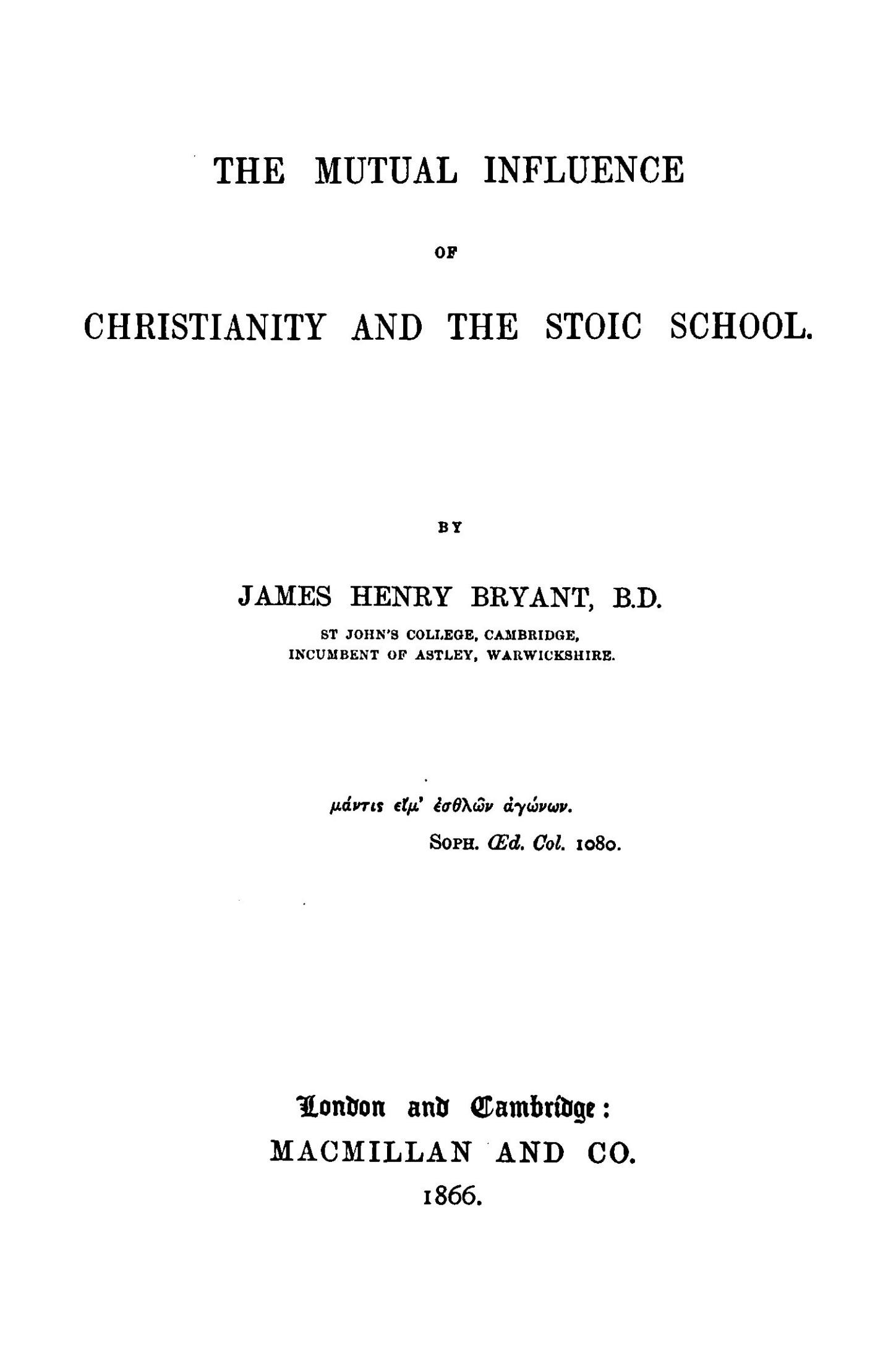 Subject proposed by the TRUSTEES for the Year 1865: ThemutualInfluenceofChristianityandtheStoicSchool.