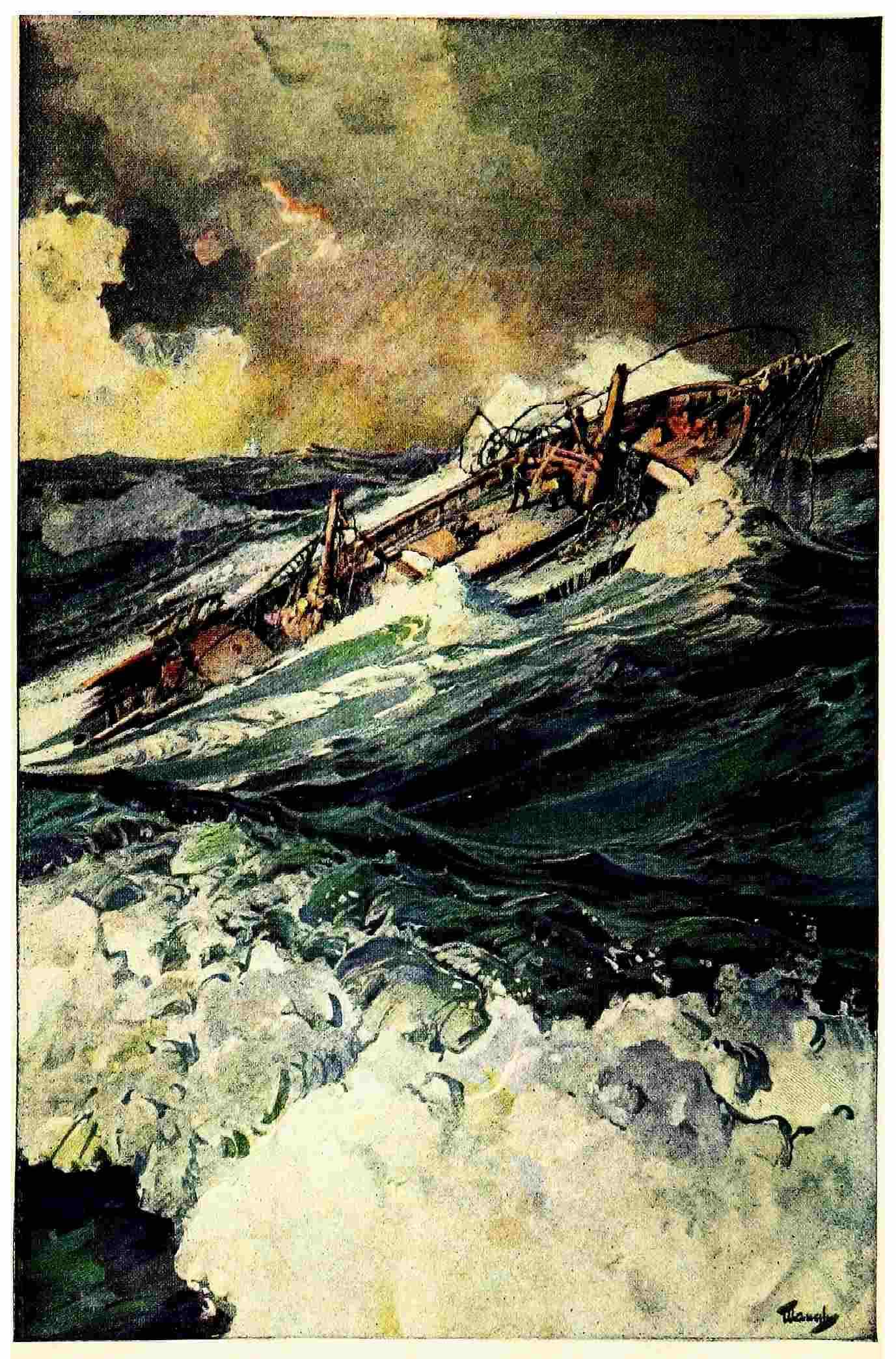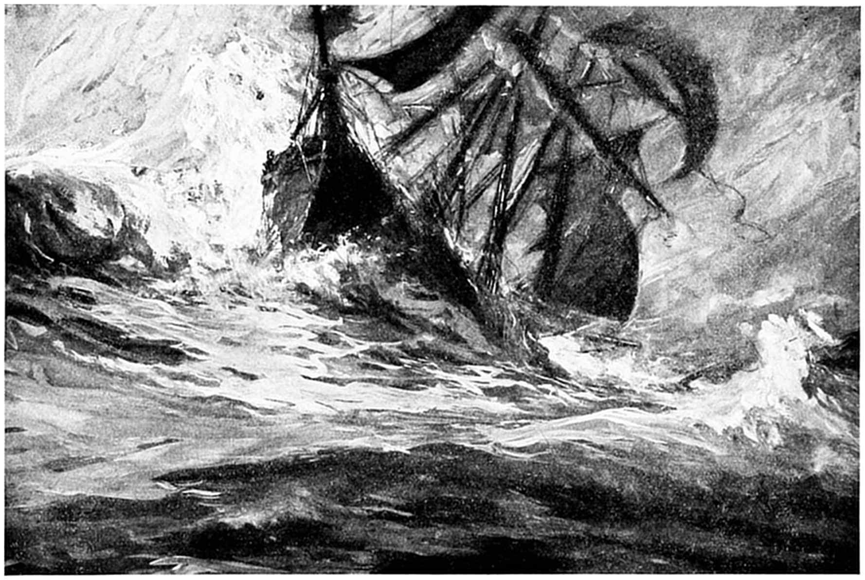 Worse was to befall her. At midnight she was capsized, or thrown on her beam-ends, as the sailor’s lingo has it. She lay on her side while the clamorous seas washed clean over her. The skipper, the mate, the four seamen, and the cook somehow clung to the rigging and grimly refused to be drowned. They were of the old breed, “every hair a rope-yarn and every finger a fish-hook.” They even managed to find an ax and grope their way to the shrouds in the faint hope that the brig might right if the masts went overside. They hacked away, and came up to breathe now and then, until foremast and mainmast fell with a crash, and the wreck rolled level. Then they slashed with their knives at the tangle of spars and ropes until they drifted clear. As the waves rush across a half-tide rock, so they broke over the shattered brig, but she no longer wallowed on her side.