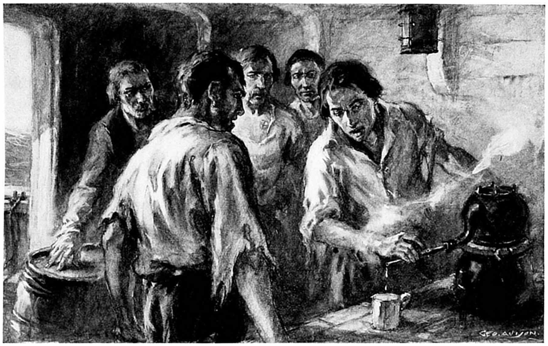 At length he took an iron pot from the galley, turned the teakettle upside down on it, and found that the rims failed to fit together. Undismayed, the skipper whittled a wooden collar with a seaman’s sheath-knife, and so joined the pot and the kettle. With strips of cloth and pitch scraped from the deck-beams, he was able to make a tight union where his round wooden frame set into the flaring rim of the pot. Then he knocked off the stock of the pistol and had the long barrel to use for a tube. This he rammed into the nozzle of the tea-kettle, and calked them as well as he could. The result was a crude apparatus for distilling seawater, when placed upon the bricked oven of the galley.