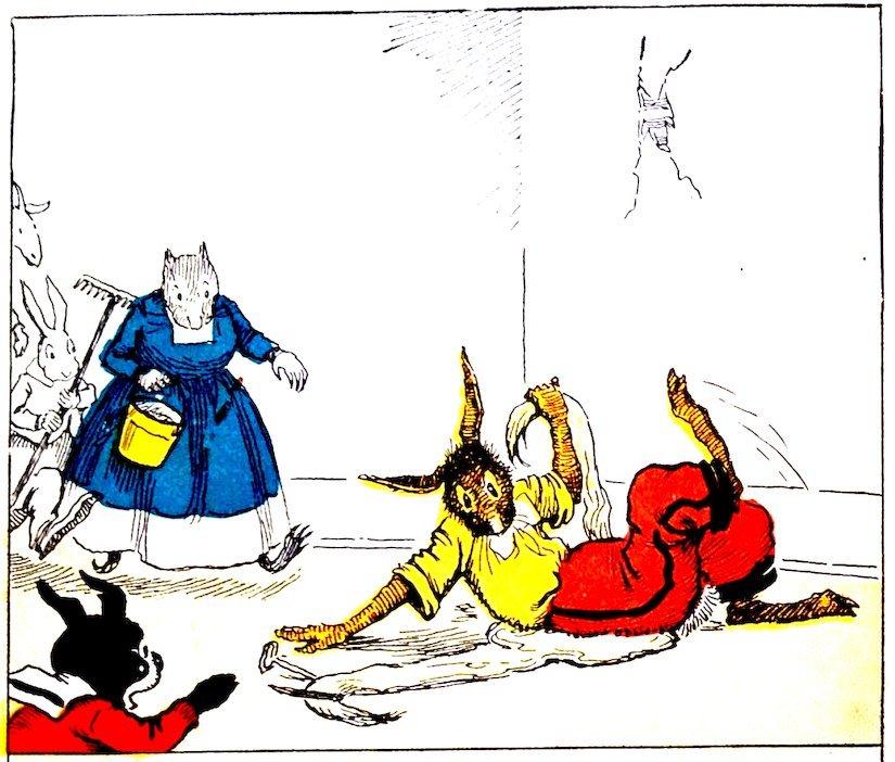 After some little time Nurse Jane managed to get Billie loose from the sticky candy. “You’d better give up trying to make taffy,” she told the bunny. “This time I’ll make it,” he said, as he slung a big lump of the sticky stuff at the hook. But the poker came loose from the wall, down fell the candy and Uncle Wiggily sat right down in it! “Help! Help!” cried the bunny, and they all rushed to help him get up.