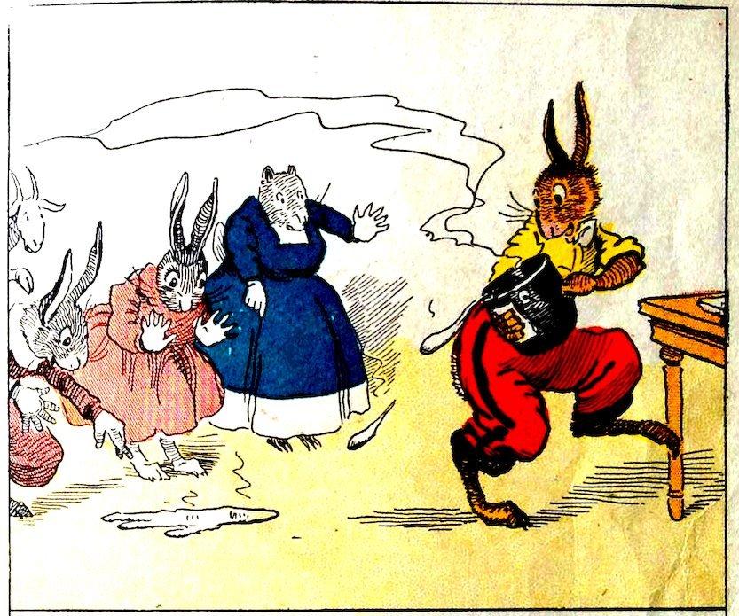 “Well, I guess the taffy has boiled long enough now,” said Uncle Wiggily after a while. The kitchen was filled with delicious smells. “Now be careful!” called Nurse Jane. Uncle Wiggily said he would, but in carrying the kettle over to the table, he spilled some on the floor. “Oh, we can pry this up and eat it when it gets cold!” cried Sammie and Susie the rabbits. Nurse Jane cried: “Look out!”