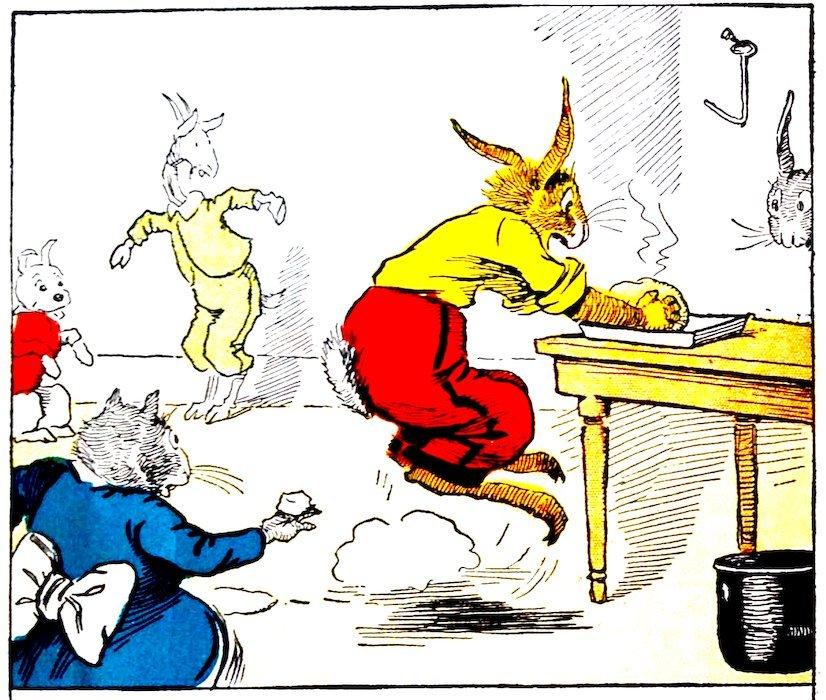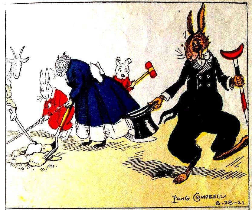 By using a kettle of warm water Nurse Jane managed to get Uncle Wiggily loose from the candy on the floor. The animal children with shovels, hoes and croquet-mallets also helped. Uncle Wiggily washed and dressed himself in his best. “Where are you going?” asked Nurse Jane as he hopped out the door. “I’m going to buy some taffy,” answered Mr. Longears. “It’s easier than making it.”