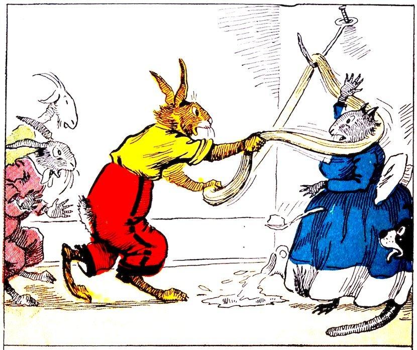 For a time it seemed that they would have to send for Dr. Possum. But at last Uncle Wiggily and the animal children got Nurse Jane free from the sticky candy rope. “Now I’ll try to pull the taffy again,” said the bunny. He threw another loop of the sticky stuff at the poker hook, but it tangled around the horns of Billie Wagtail. “Baa-aa-aa! Maa-aa-aa!” bleated Billie. “Dear me!” said the bunny.