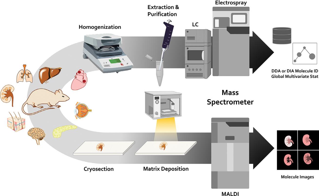FIG. 1.1 A comparison between bulk tissue analysis workflow using electrospray liquid chromatography–mass spectrometer and tissue imaging using matrix-assisted laser desorption/ionization mass spectrometer.