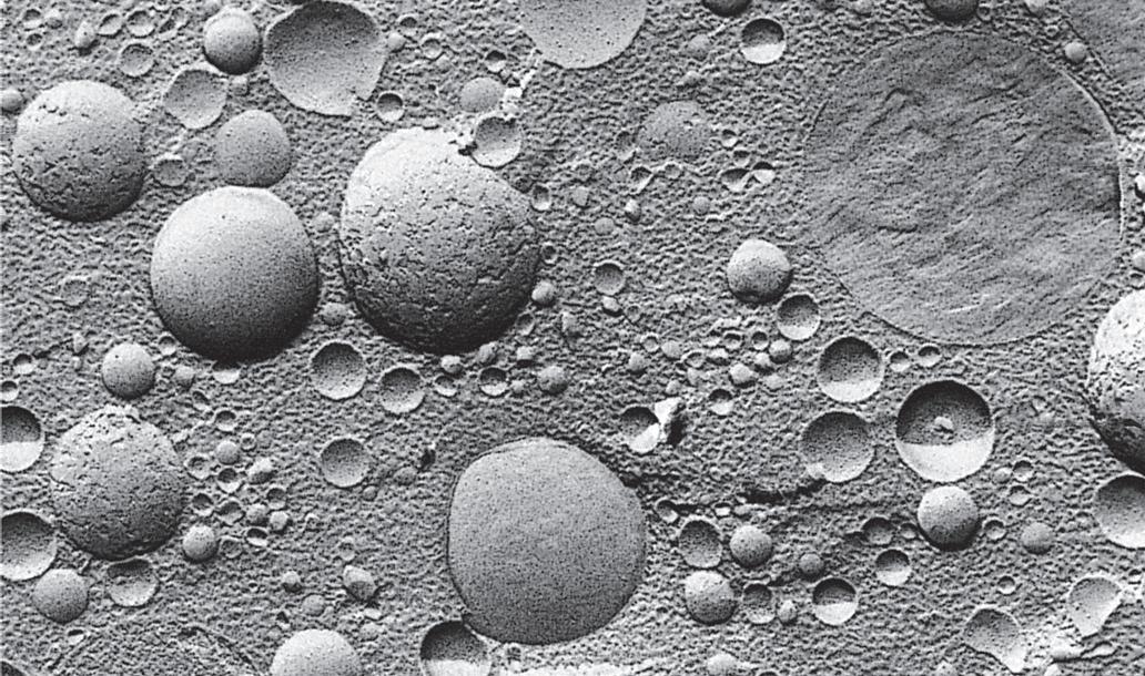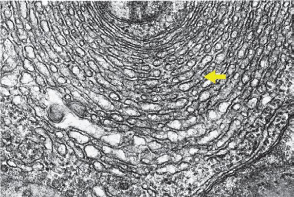 The arrow indicates smooth or agranular endoplasmic reticulum (SER). This usually takes the form of a tightly woven network of branched tubules with no ribosomes attached [point of difference with the rough endoplasmic reticulum (RER)]. RER proliferates to SER, where the synthesis of lipid and steroid molecules occurs. Therefore, there is pronounced expansion of SER in steroid hormone–producing cells, such as the one in the figure, obtained from corpus luteum (progesterone-secreting granulosa lutein cells).