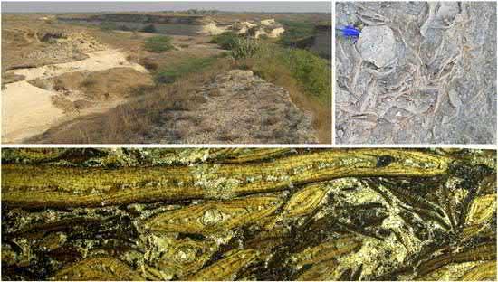 Figure1.5 Eocenenummulitic limestone:extensiveoutcropin Kutch,India(topleft),acloseupviewofthelimestone showingtestsof Nummulites (topright),andapetrographic thinsectionviewofthe nummuliticlimestone(bottom).