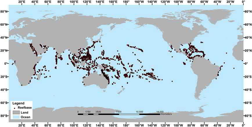 Figure1.3 Mapshowingtheglobaldistributionofcoralreefs,themajorsitesofpresent-day,shallowwater carbonatedeposition. Source:Reproducedwithpermission r NationalOceanServices,USA.