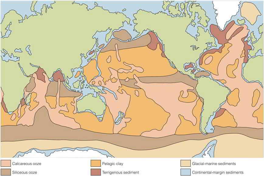 Figure1.1 Distributionofneriticandpelagicsedimentsontheoceanfloor.Calcareousoozecomprising foraminifera,pteropods,andcalcareousnannoplanktonareshowninpink. Source:AfterSkinner,B.J.,Murck,B.,2011. TheBluePlanet AnIntroductiontoEarthSystemScience,thirded.JohnWiley&Sons,Inc.(SkinnerandMurck,2011), reproducedwithpermission r JohnWiley&Sons-Books.