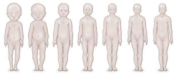 FIG. 1.3 Evolution of head-to-trunk proportion throughout growth. In the neonate the head is proportionately significantly larger relative to the trunk than it will be at skeletal maturity. (Reproduced from Hensinger RN. Standards in Pediatric Orthopedics. New York: Raven Press; 1986.)