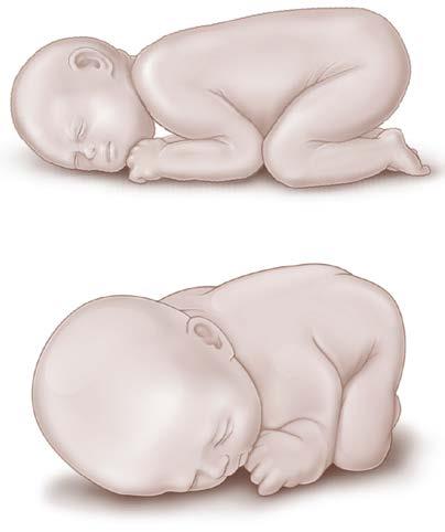 FIG. 1.2 Typical position of the neonate with vertex presentation. The hips and knees are flexed, the lower legs are rotated internally, and the feet are rotated further inward on the lower leg. The lower limbs are contracted into this position for a variable period after birth.