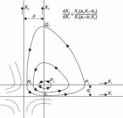 Webeginwithreferringthereadertoourfirstcomplexitybook(Sieniutycz,2020)and remindingtheLotka-Volterraoscillatorymodel(Lotka,1920,1922),whosegraphisshownin Fig.1.1.ThisoscillatorymodelyieldsanequationdescribingtheratiodX2/dX1 intherightpart of Fig.1.1,whichcharacterizestheinteractionsbetweenpopulationsoftwospecies:predators (foxes)andpreys(rabbits).