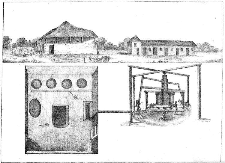 The sugar engenhos are some of them very considerable, and the two accompanying plates are representations of the exterior and interior of the Engenho de Torre not far from the right margin of the Capibaribe. The owner, who has amassed a respectable property, very politely allowed four gentlemen with myself to see this establishment. The juice is extracted by the compressure of the cane between three upright rollers, the centre one moving the other two, and being itself constantly carried round by relays of mares, which have a singular appearance from their ears being closely cropped. The juice flows along a channel to a lower apartment in the building, where it goes through the different processes of boiling, and when