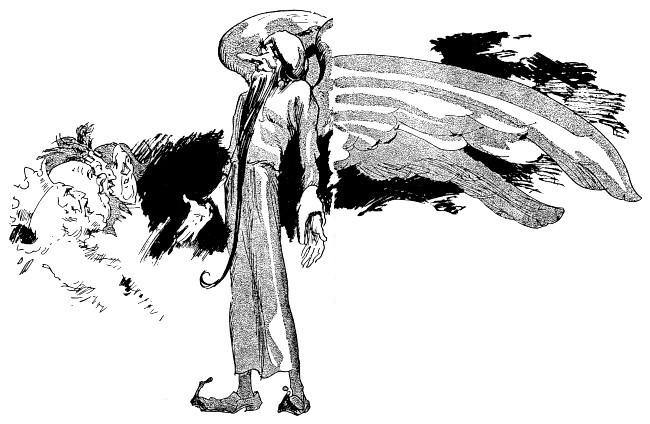 "Immediately," continued the wily Soothsayer, "these wings attached themselves to my shoulders. Flying into the Prince's bed chamber, I lifted him in my arms and carried him to the great capital of Oz. Leaving him in the kindly care of our gentle ruler, Ozma, I stole into the garden and seizing a mortal maiden returned to the Ozure Isles and left her in the cave of Quiberon." Folding his arms proudly he waited for the King's commendation.