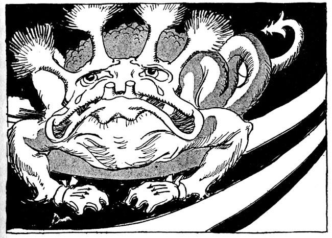 "Bite a Public Benefactor, would you?" sniffed Benny, stepping calmly out as the monster opened his mouth, and before Quiberon had recovered he snatched up the Scarecrow and pounded after Trot. They had almost reached the end of the dim blue corridor before Quiberon appeared at the head. Five times as furious as he had been before, he came crashing on like an express train. Trot dared not look over her shoulder, and even Benny felt that nothing could save them now. Without plan or hope they dashed on, till an ear splitting screech brought them to a sudden stop.