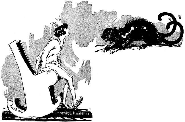 The firelight lit up the little cottage quite cheerfully and after looking all over and even taking a candle end into the attic, Philador curled up in a big easy chair to await the return of the good witch. "She's probably out visiting a neighbor," decided the little Prince sleepily. The chair was so comfortable, and Philador so drowsy from his long fly through the night air, he soon fell fast asleep and dreamed he had found his royal mother and saved his father's Kingdom. A soft thud in his lap wakened him next morning and starting up in alarm he looked straight into the green eyes of the cat with two tails.