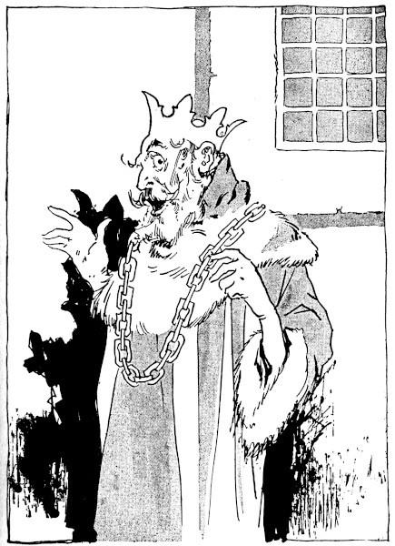 and bottles. With both hands in his pockets and his crown on the back of his head, the little Prince tried to decide which to take. The labels were mostly in magic, a language Philador had unfortunately never studied. Taking down a blue box he started to open it. Now this box had an eyelid and it winked at Philador so knowingly that he gave a jump and knocked a simply enormous bottle from the shelf over his head. The bottle fell to the floor with a loud crash, breaking into three separate pieces and a thick brown liquid began to ooze out upon the floor. As Philador, dropping the blue box, looked down in fright and dismay, the liquid began to run into the shape of a man. Backing into a corner the little Prince watched the queer figure forming on the floor. It grew more and more distinct, thickening through the middle and finally as Philador, with both hands before his face, backed as far into the corner as he could, the man out of the bottle curled upward and made him a deep bow.