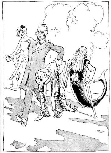 "Now you laugh 'He!', I'll laugh 'Ho!' and Trot must laugh 'Hah!'", directed the Scarecrow solemnly. So at his signal Benny burst into a loud "He!" Trot into a shrill "Hah!" and the Scarecrow into a husky "Ho!" At the same time they rocked all together and fixed their eyes expectantly upon the door. Much to Trot's surprise, it instantly swung inward, and an old mer-man on crutches stood in the opening.