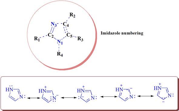 Imidazole was first synthesized in 1858 by Debus, who isolated derivatives from three-component compounds like dicarbonyl, aldehyde, ammonia, or its salts [8, 9]. After this reaction, many syntheses were demonstrated after 1858 allowing access to various imidazole derivatives. Imidazole has specific characteristics, i.e., it is planar, a five-membered heterocyclic molecule which constitutes three carbon atoms and two nitrogen atoms at the first and third positions. It is soluble in water and a highly polar compound due to the presence of dipole moment. It has an amphoteric nature, i.e., it works as an acid as well as a base. This property is explained by resonance interactions, which increase the basicity of two nitrogen atoms and make electrophilic and nucleophilic attacks feasible. The resonance structures of imidazole are shown in Fig. 1.2 [10]