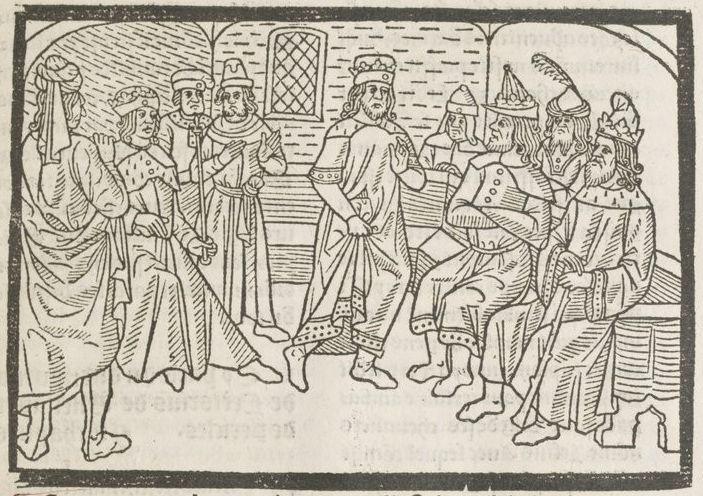 Adonc pour ensuivir l’enseignement du sage qui dist/ espreuve l’omme ains que moult t’y fyez/ voulut esprouver la loyauté et obeissance d’iceulx gaules si leur envoya lettres lesquelles entre les autres choses disoient qu’il leur deffendoit que bien se gardassent de ouvrir unes petites lettres/ lesquelles estoient encloses es grandes lettres qui leur envoioit jusques a certain jour qui nommé y estoit/ mais ainçoys que icelluy jour fust venu/ il les renvoya querir avec les ouvertes/ et comme iceulx eussent passé son commandement/ congneut bien qu’ilz ne leur estoient pas feaulx/ sy ne s’y fia plus en grant chose.