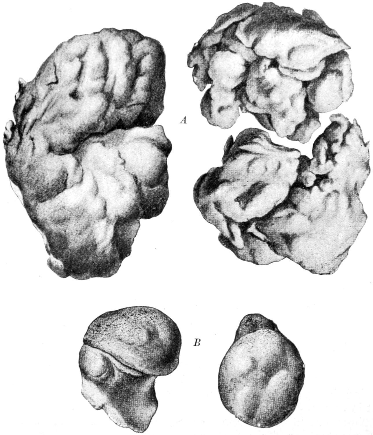 Prostate removed by the perineal route: A, lateral lobes; B, intravesical growth particularly obstructing urethral entrance. (Proust.)