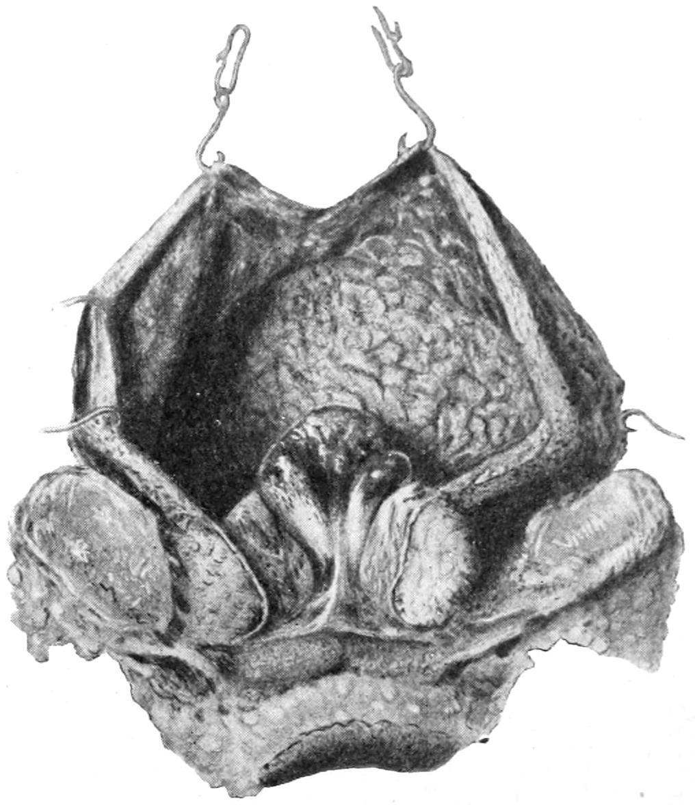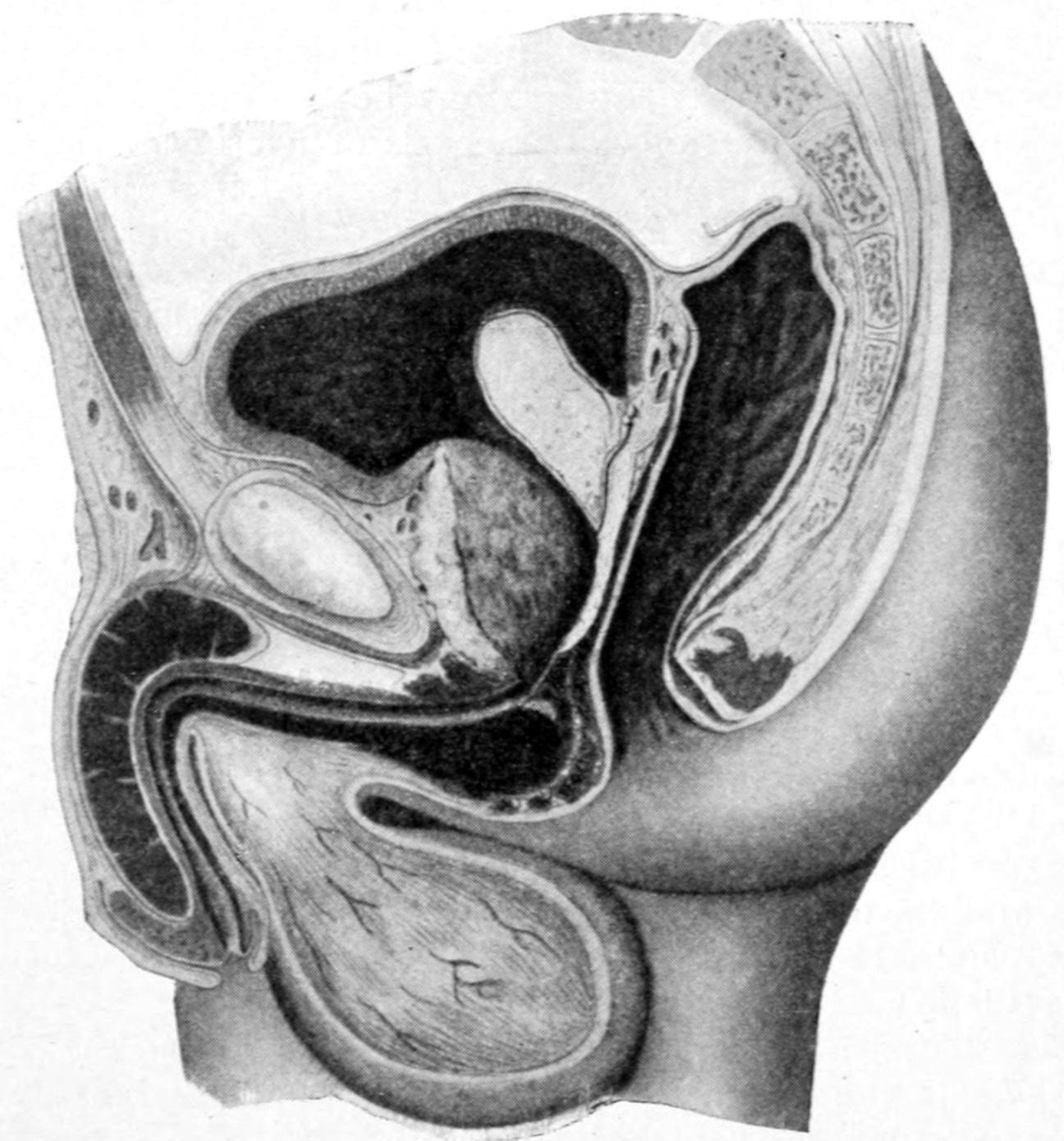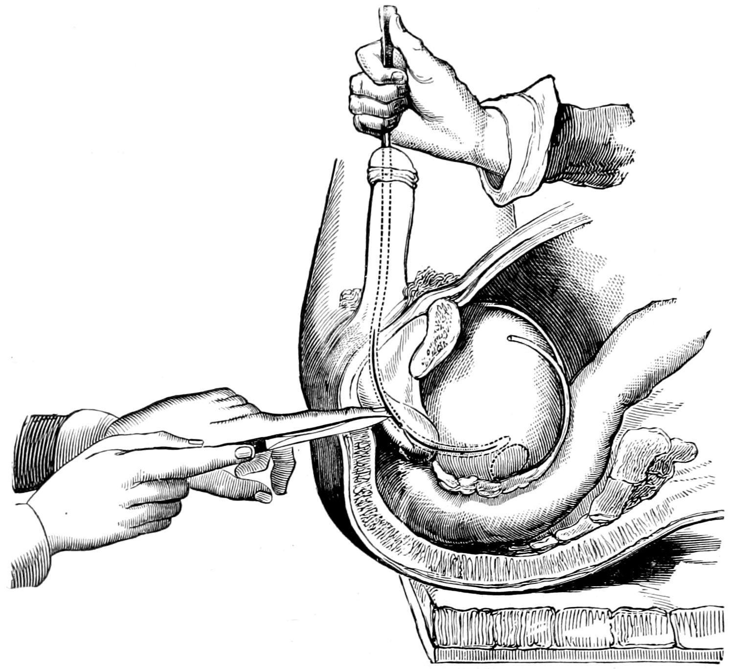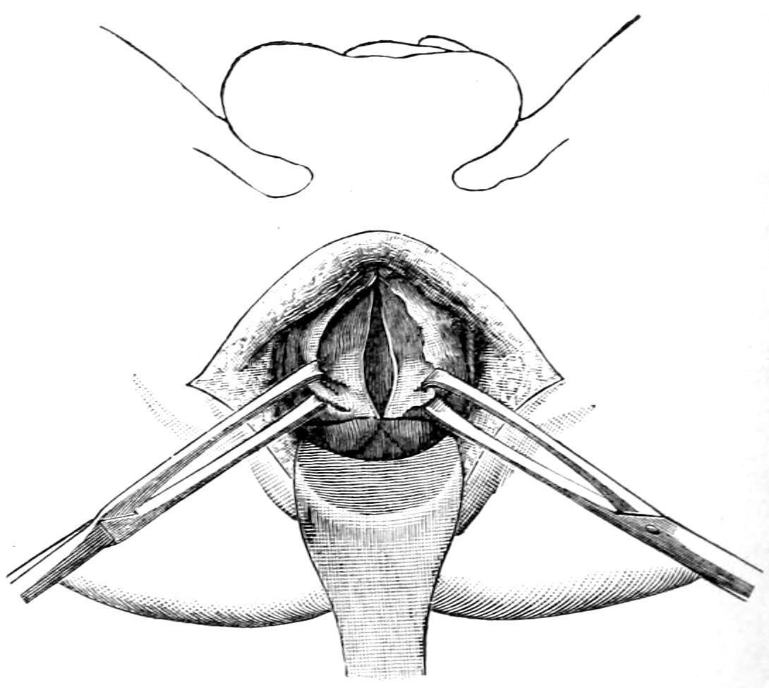 [70] In a recent case I have been able to more easily effect this procedure by raising a flap, including the tissues of the mons, exsecting a portion of the symphysis containing the insertion of the recti, by oblique division, in such a way that when replaced the bone could not be easily displaced, and in this way uncovering the space of Retzius so that, by combined manipulation, it was easier to detach the bladder wall from its surroundings.