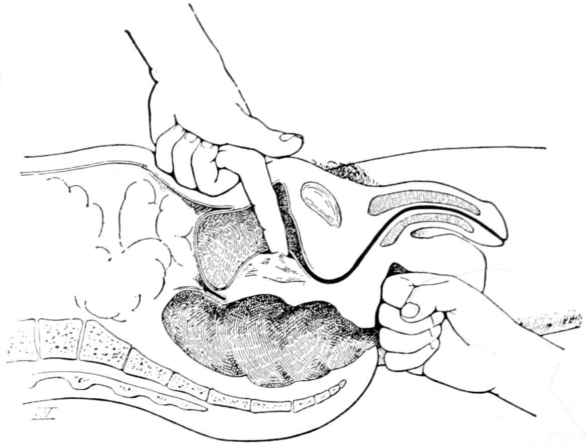 Suprapubic prostatectomy. Process of enucleation by finger-tip of one hand in the bladder, the other hand making pressure in the perineum. (Hartmann.)