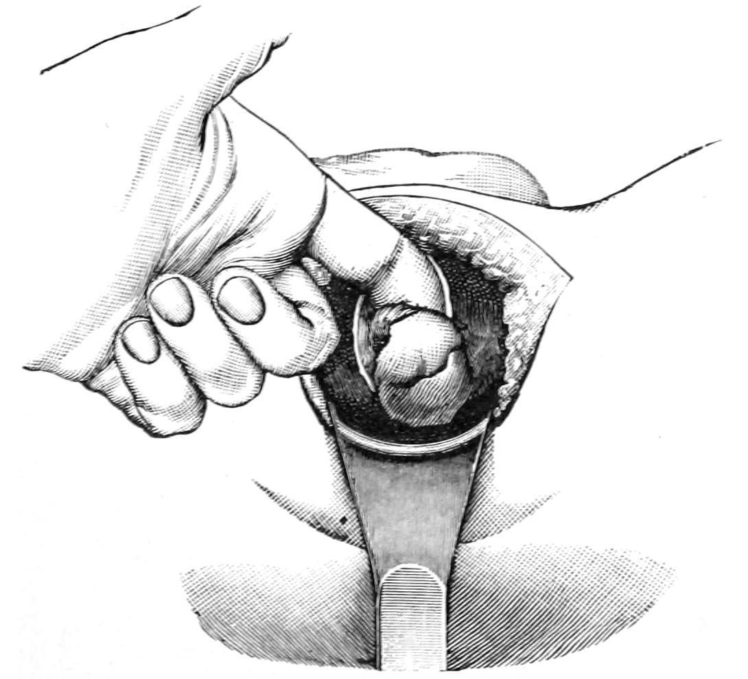 Hemisection of prostate, each half being secured within the bite of vulsellum forceps. (Proust.)