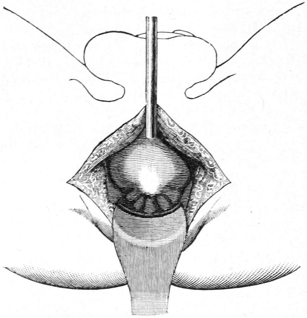 First exposure of prostate after introduction of sound through opening just in front of it. (Proust.)