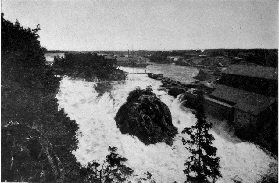We landed at the first sluice and immediately stood in a kind of English garden; the broad pathways are covered with gravel and rise in low terraces between the green sunlit greensward. It is charming and delightful here, but by no means imposing; if one desires to be excited in this manner, he must go a little higher up to the old sluices, that have burst, deep and narrow, through the hard rock. Nature is magnificent here, and the water roars and foams in its deep bed far below. Up here one looks over valley and river; the bank of the river on the other side rises in green undulating hills, with clusters of leafy trees and wooden houses painted red; rocks and pine forests hem in the landscape. Through the sluices steamboats and sailing vessels are ascending; the water itself is the attendant spirit that must bear them up above the rock. And from the forest it issues, buzzing, roaring, and blustering. The din of the Trollhätta Falls mingles with the noise of the sawmills and the smithies.