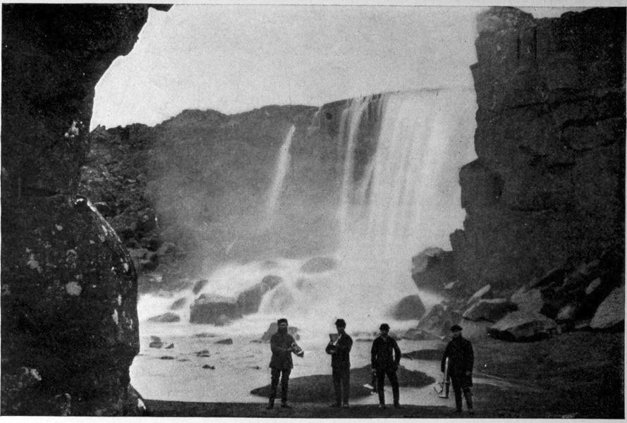 But to return where I left myself, on the edge of the cliff, gazing down with astonished eyes over a panorama of land and water imbedded at my feet. I could scarcely speak for pleasure and surprise; Fitz was equally taken aback, and as for Wilson, he looked as if he thought we had arrived at the end of the world. After having allowed us sufficient time to admire the prospect, Sigurdr turned to the left, along the edge of the precipice, until we reached a narrow pathway accidentally formed down a longitudinal niche in the splintered face of the cliff, which led across the bottom, and up the opposite side of the Gja, into the plain of Thingvalla.