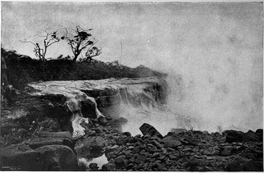 First of all we descended the precipice, 300 feet in depth, forming the wall of the old crater, but now thickly covered with vegetation. It is so steep in many places that flights of zigzag wooden steps have been inserted in the face of the cliff in some places, in order to render the descent practicable. At the bottom we stepped straight on to the surface of cold boiled lava, which we had seen from above last night. Even here, in every crevice where a few grains of soil had collected, delicate little ferns might be seen struggling for life, and thrusting out their green fronds towards the light. It was the most extraordinary walk imaginable over that vast plain of lava, twisted and distorted into every conceivable shape and form, according to the temperature it had originally attained, and the rapidity with which it had cooled, its surface, like half-molten glass, cracking and breaking beneath our feet. Sometimes we came to a patch that looked like the contents of a pot, suddenly petrified in the act of boiling; sometimes the black iridescent lava had assumed the form of waves, or more frequently of huge masses of rope, twisted and coiled together; sometimes it was piled up like a collection of organpipes, or had gathered into mounds and cones of various dimensions. As we proceeded the lava became hotter and hotter, and from every crack arose gaseous fumes, affecting our noses and throats in a painful manner; till at last, when we had to pass to