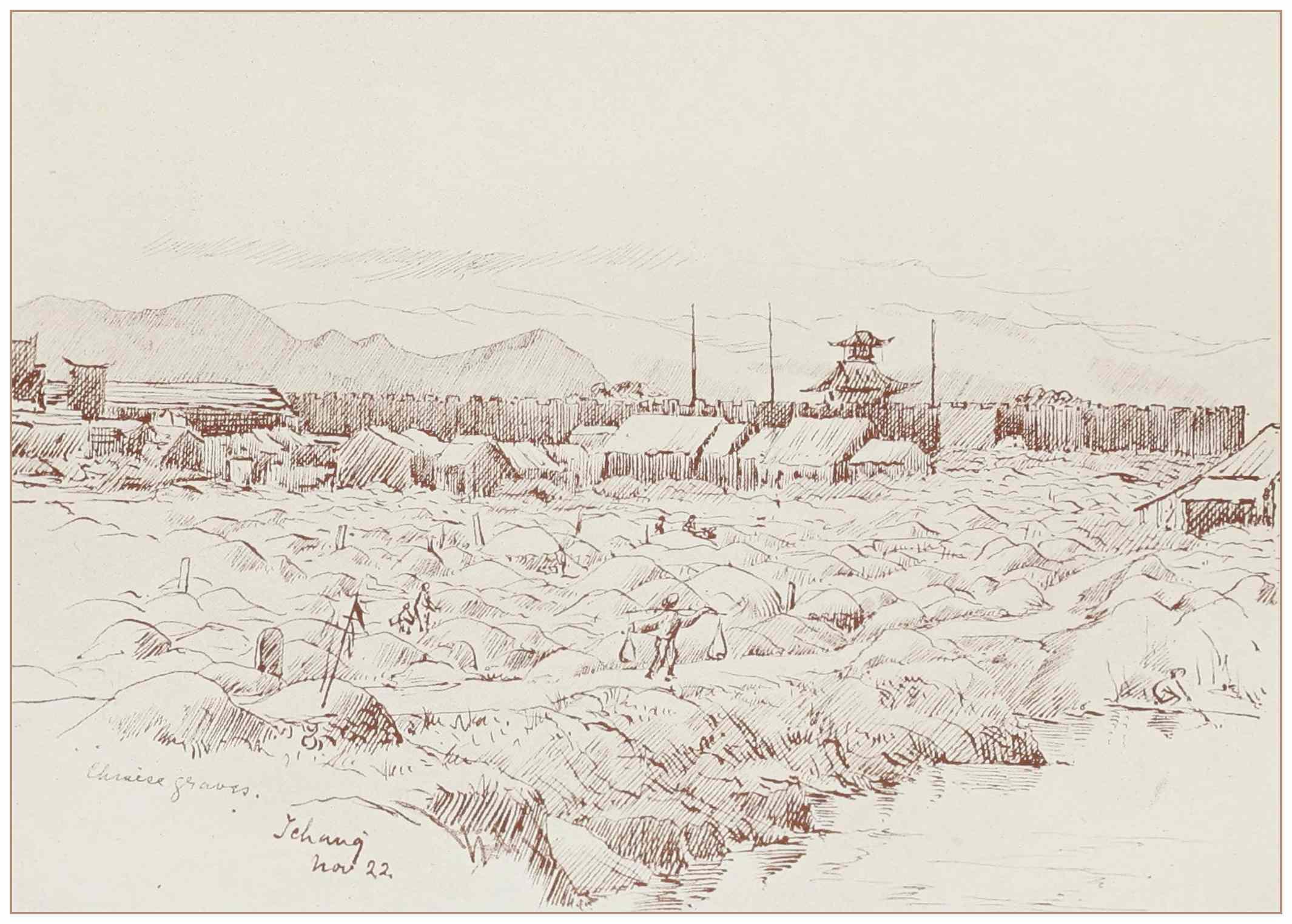 From my sketch some idea may be formed of the vast multitudes of graves outside Ichang: some have sticks planted in them with little paper streamers. Wherever we travelled we saw the same sight —endless graves speaking of the innumerable dead.