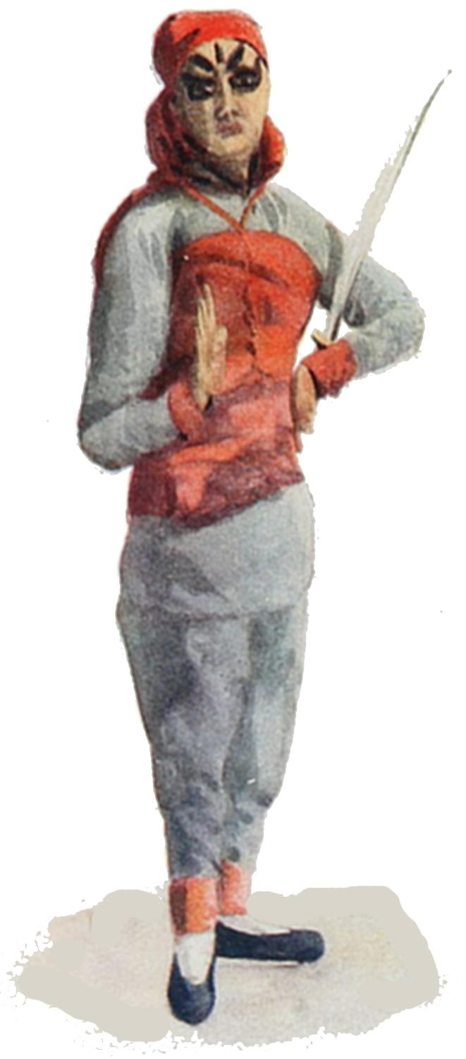 soon turned into mere plunderers. The sketch gives the costume of a Peking Boxer, with upraised hand making a military sign; but they had no regular uniform, and merely wore red as a distinctive mark.