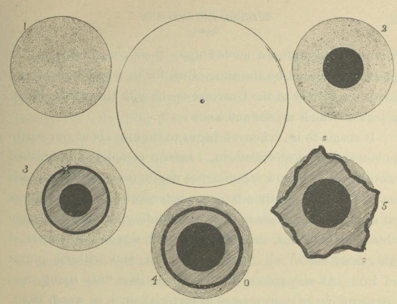 In the illustration at the head of this chapter the large ring represents the earth as a vast ball of hot vapor. The very small ring in the centre shows the present size of the globe as compared with its first expansion. The circle marked 1 shows the earth as a simple sphere of vapor, its earliest condition. The circle 2 shows us the stage where, by the force of gravity, and the cooling resulting from the radiation of heat, the sphere of gas began to have a fluid centre, or core. We must understand that the condensing particles in the centre were not rendered solid, but fluid, as you may see the molten glass or iron at a glass-works or iron-foundry. This fluid state probably still continues at the centre of the earth. Figure 3 shows us the condensation going on. As the globe cools, a solid crust, marked x, is formed around the fluid centre, and between the centre and the crust the matter of the globe is hardening, while the outer envelope beyond the crust is still gas.